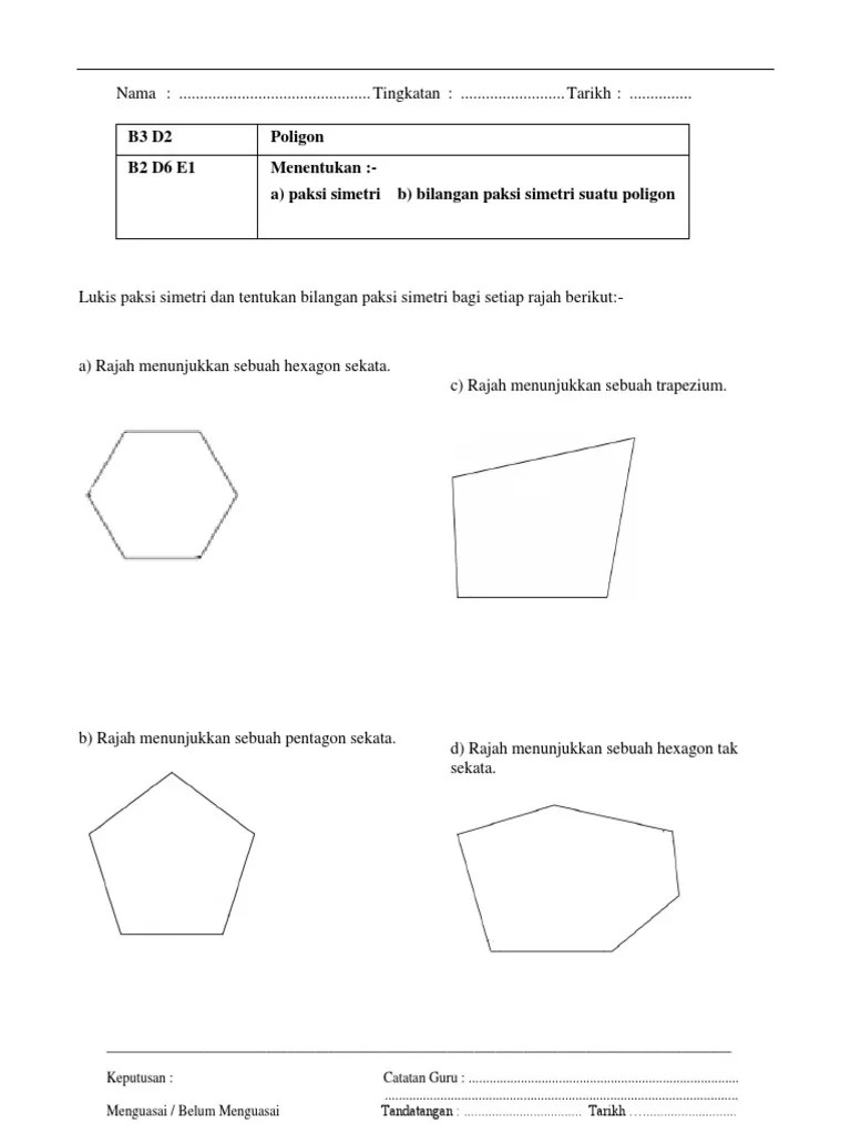 Semua poligon sekata dengan n sisi,. Nilai bagi 2 adalah kurang daripada 3 . A nyatakan bilangan paksi simetri bagi poligon di bawah. Bil sisi dan paksi simetri. Poligon definition and synonyms of poligon in the malay dictionary. State the number of axis of symmetry for the polygons below. Bilangan paksi simetri bagi suatu poligon sekata ialah 6. Mencari bilangan sisi dan paksi simetri. Bilangan paksi simetri bagi sebuah poligon sekata dengan n sisi ialah ______. The number of axes of symmetry of a regular poligon is 6. Berapakah bilangan paksi simetri bagi poligon di atas? Menentukan paksi simetri poligon sekata.